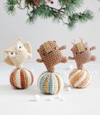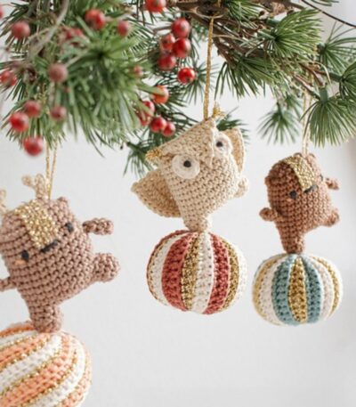 Crochet Kit Christmas Ornaments Dancing Bear Reindeer & Owl on striped Baubles, hanging / standing amigurumi decorations, Vintage Circus