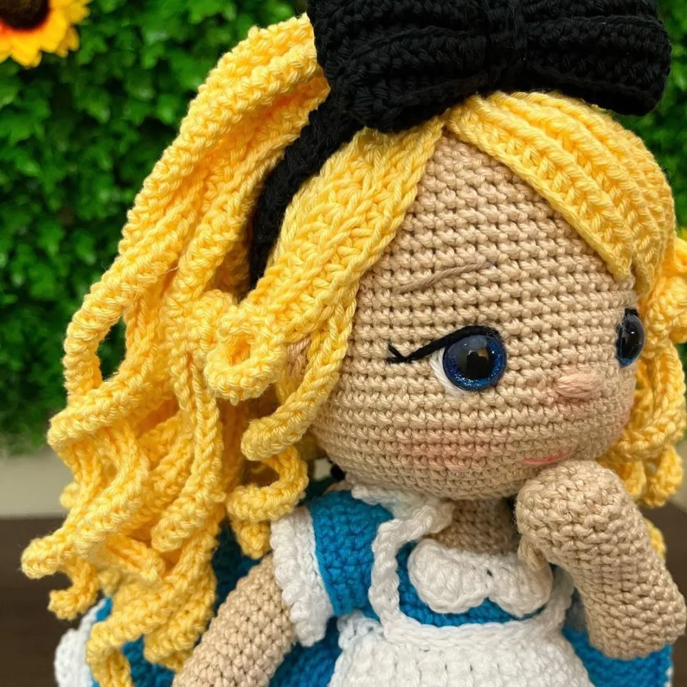 - A beautiful, handcrafted Amigurumi Alice Doll.