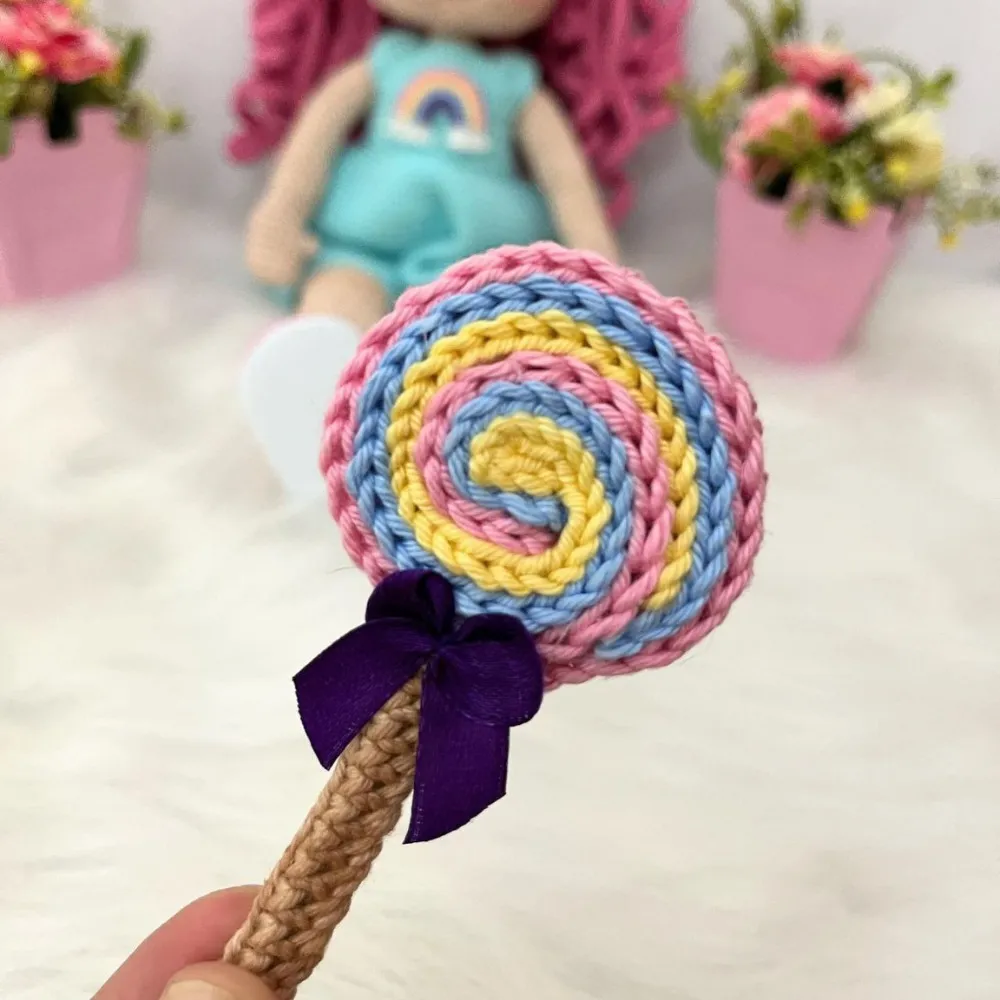 Crochet Doll Pattern with Pink Hair, Rainbow Dress & Lollipop – Cute Handmade Gift for Kids