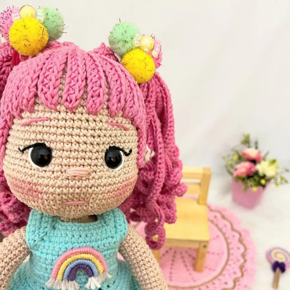This crochet pattern offers more than just instructions—it provides a joyful crafting experience and the opportunity to create a treasured keepsake. Whether you’re making it for a child, a loved one, or yourself, the Doll with Pink Hair in her rainbow dress and lollipop accessory is sure to bring smiles and spark imagination.