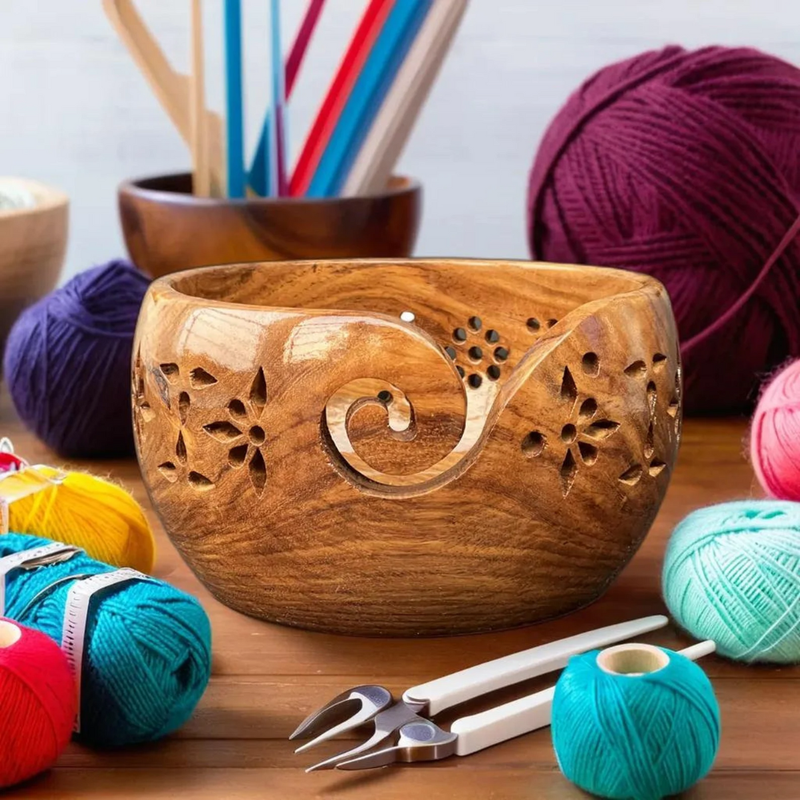 Large Yarn Bowl with Carved Holes & Drills | Knitting Crochet Accessories | Solid Wood Yarn Bowl For Crochet and Knitting Gift for knitter