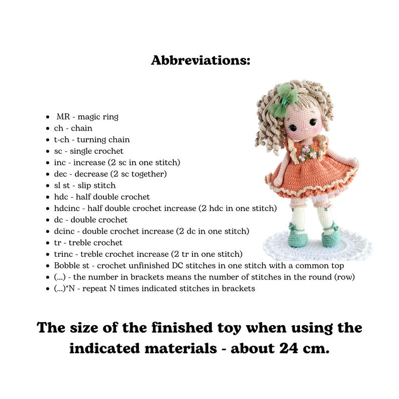 The size of the finished toy when using the listed materials is about 24 cm (9.4 inches).