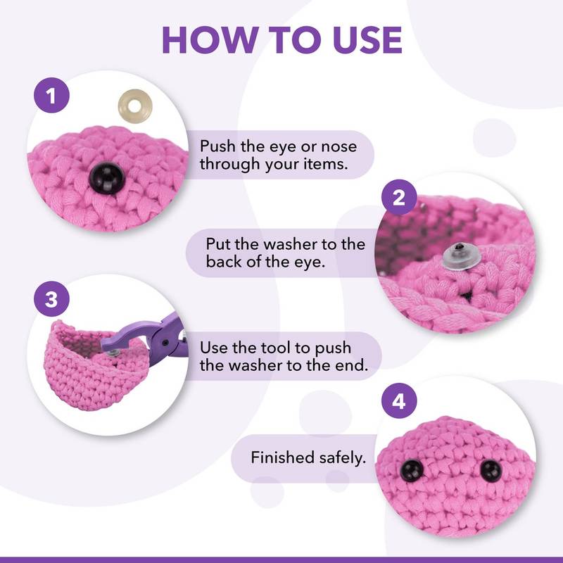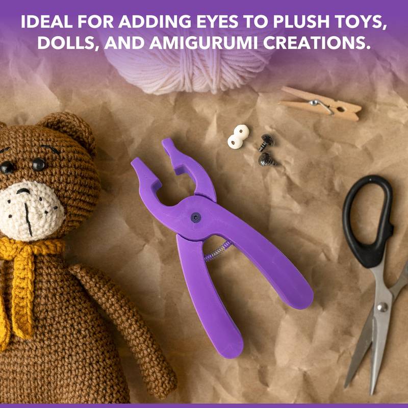 Designed to make attaching the backs of safety eyes to your amigurumi plushies effortless. The ergonomic design accommodates all sizes of safety eyes, ranging from 5mm to 30mm. To use, insert the safety eye into the plush, then either lightly place the back washer onto the eye and press with the pliers or align the back of the safety eye with the hole in the pliers and squeeze to secure. It’s that simple! Just thread the pin of the eye and the back into the hole side of the pliers, close them, and the dimple will push the eye into place. Voilà, the safety eye is inserted!