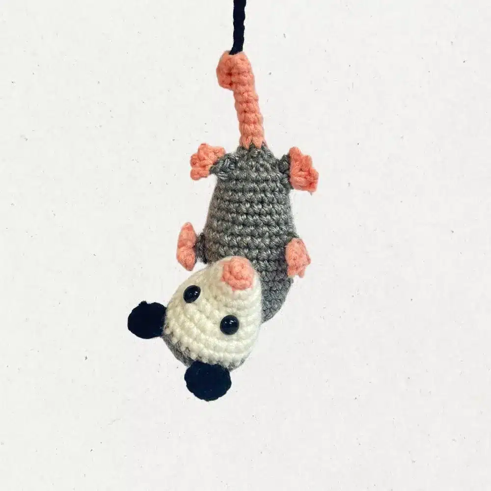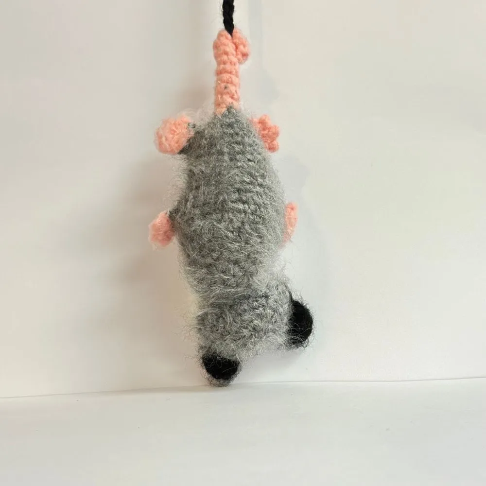 - An adorable, handmade amigurumi Waffles the Hanging Opossum.