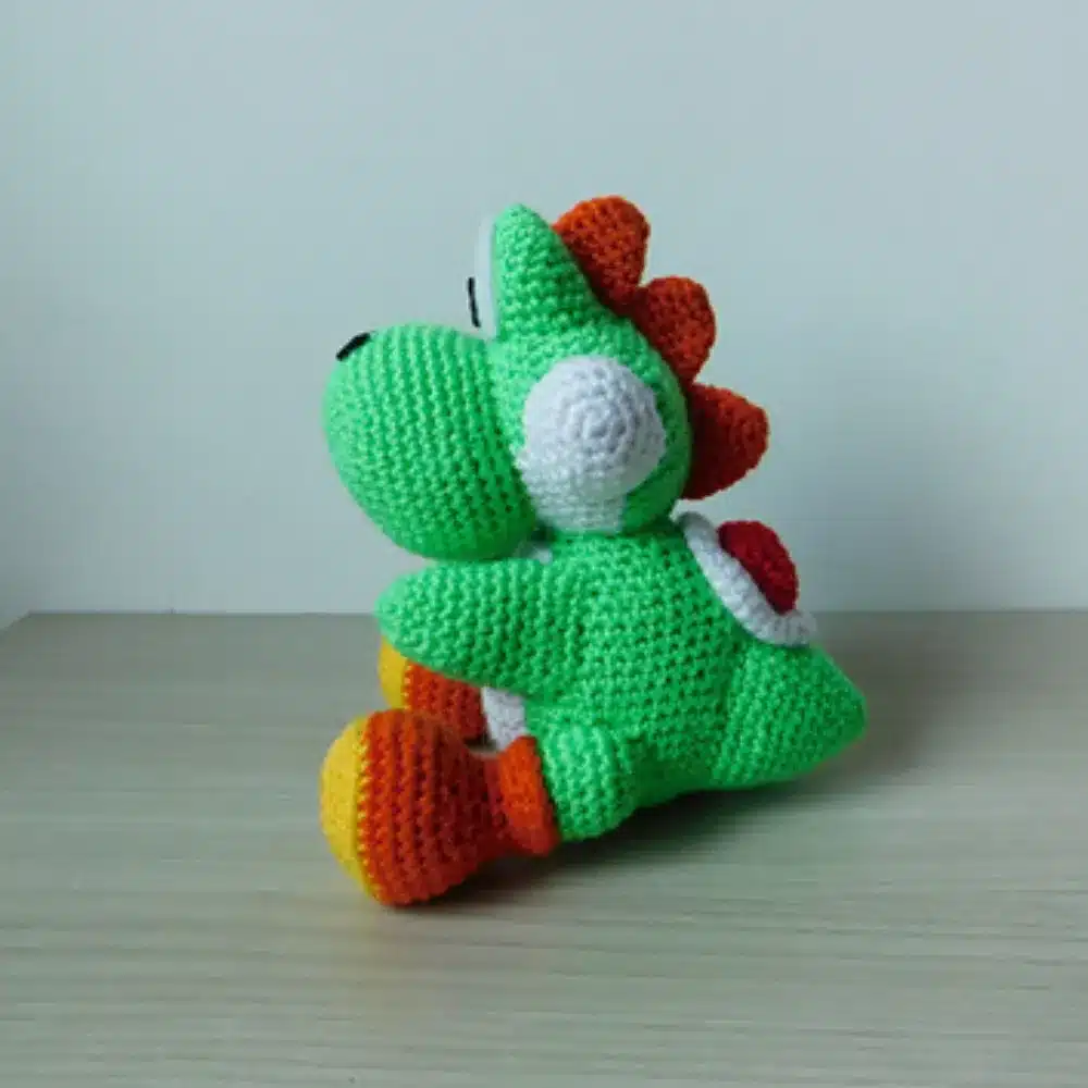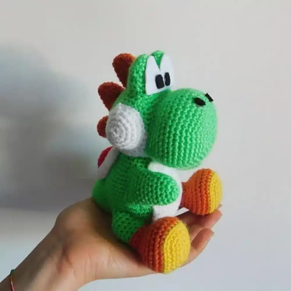 - An adorable, handmade amigurumi figure of Yoshi, Mario’s loyal dinosaur friend.